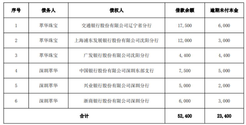 萃华珠宝的债权人这个春节可能将过得并不安心。萃华珠宝近日公告称,公司及子公司借款逾期本金达2.34亿元。逾期涉及交通银行、浦发银行、广发银行、中国银行、兴业银行和浙商银行等六家金融机构。