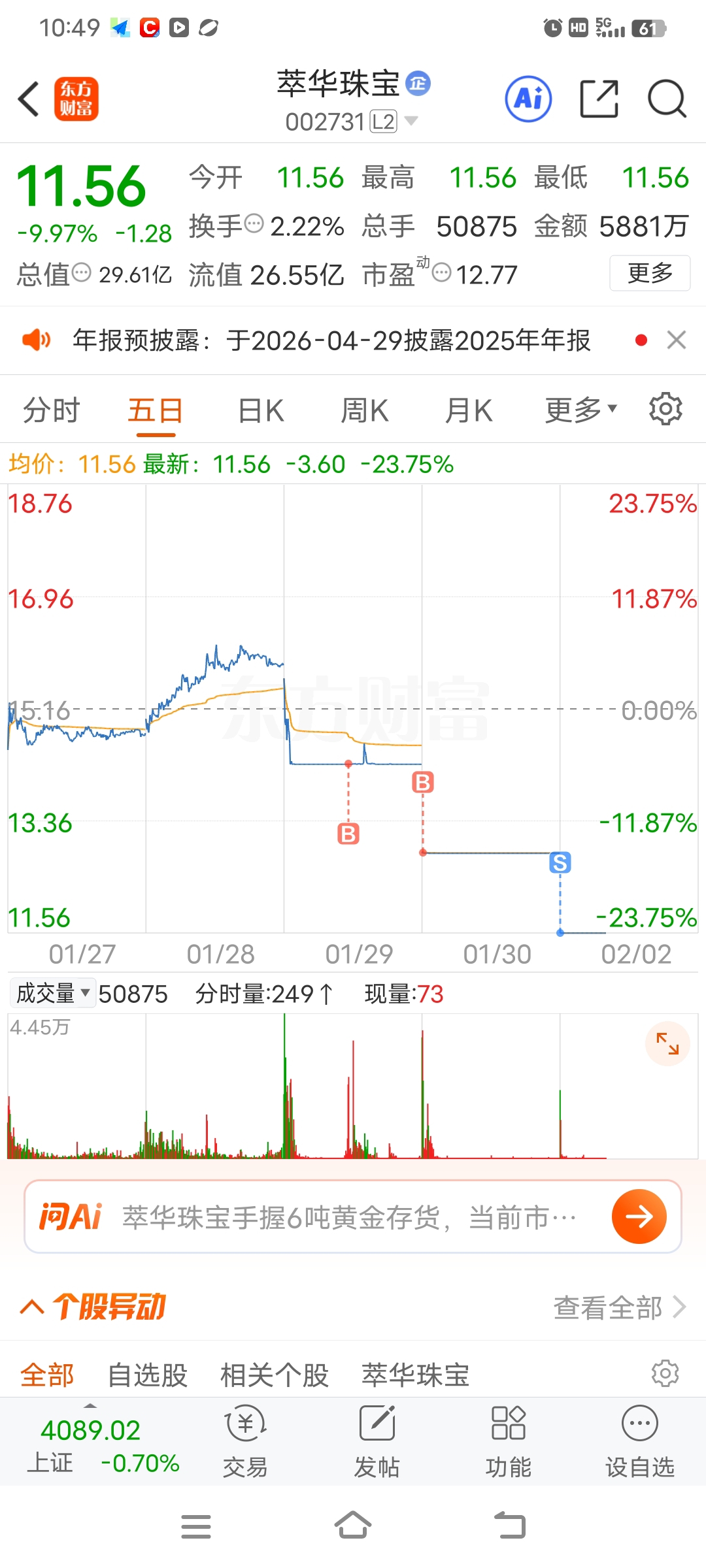 $萃华珠宝(SZ002731)$ 准备再加个仓的,忍住割肉了,三个地板,,还没开板迹象,什么仇什么怨。