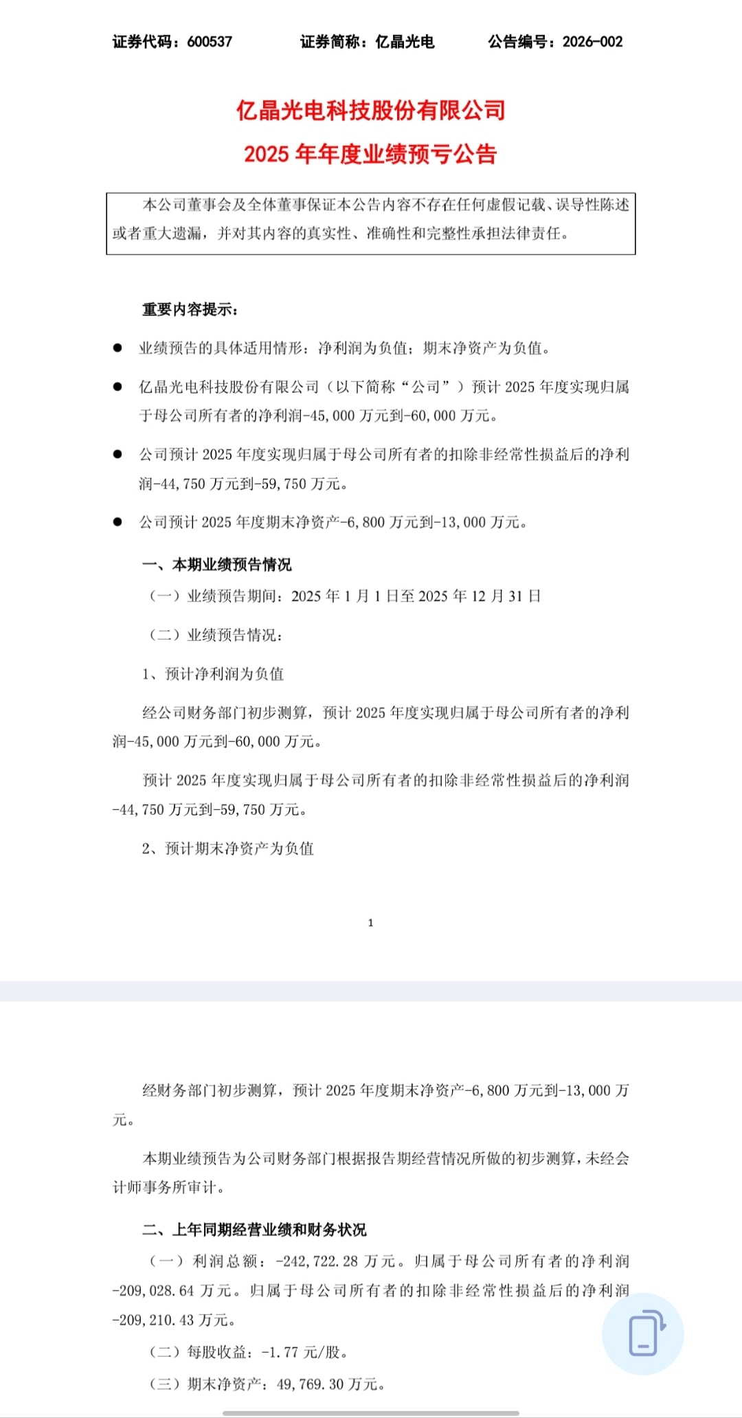 然后再来对比下亿晶光电,人年报巨亏+资不抵债+退市警示(附在下图),三个板后也开了,你扣非大增+锂矿赚钱+6吨黄金,也能三个板,演都不演就硬压,坏的一批~