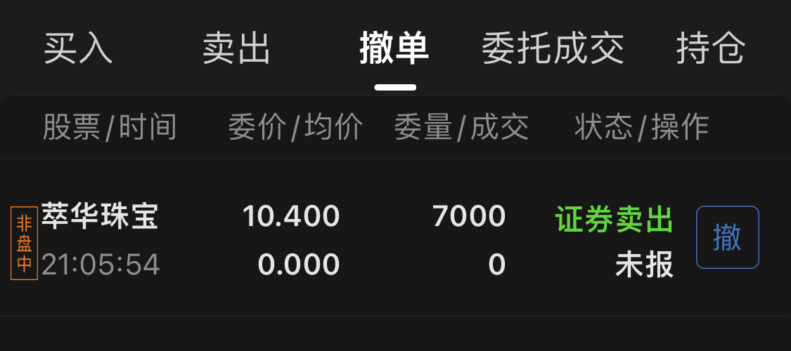 $萃华珠宝(SZ002731)$ 顶不住了,已挂单,亏了三十个点