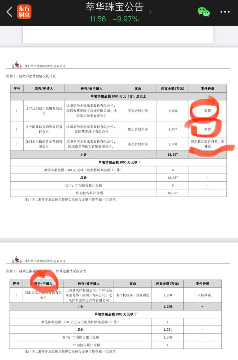 $萃华珠宝(SZ002731)$ 两个诉讼和解,一个没收到起诉,一个是原告告老凤祥,事情不是解决了吗?库存几十亿黄金,却有钱不还,到底要整哪出?