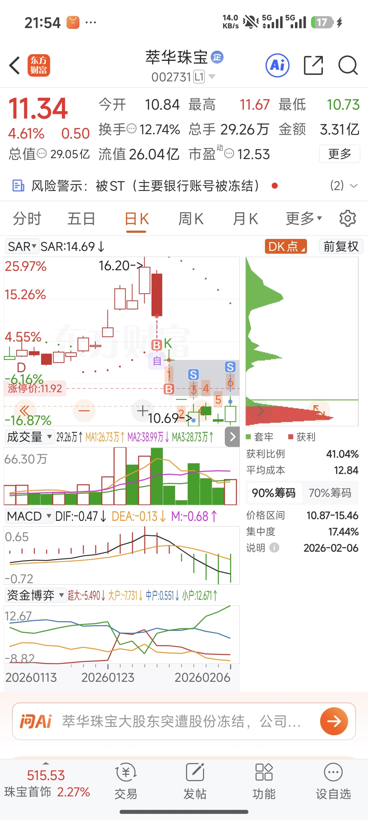 $萃华珠宝(SZ002731)$ 吃了三个地板亏了三十一个点,今天心血来潮突然想卖,逃过一劫
