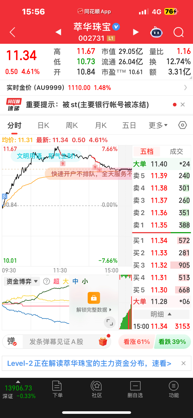 $萃华珠宝(SZ002731)$ 周五哭了一天
