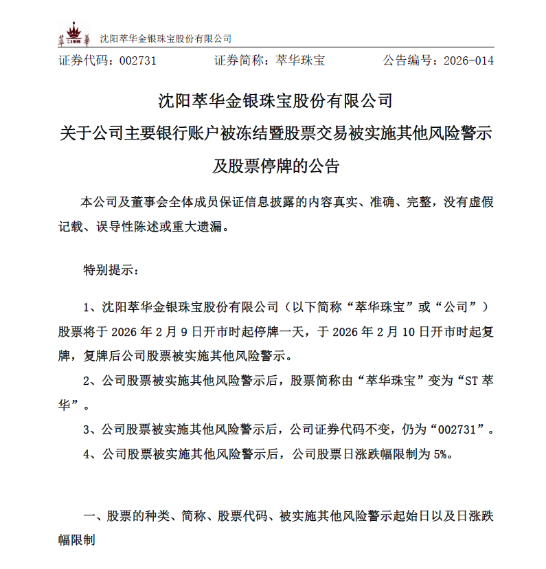 萃华珠宝索赔登记。因涉嫌信披违规被证监会立案调查,突发主要银行账户被冻结被实施其