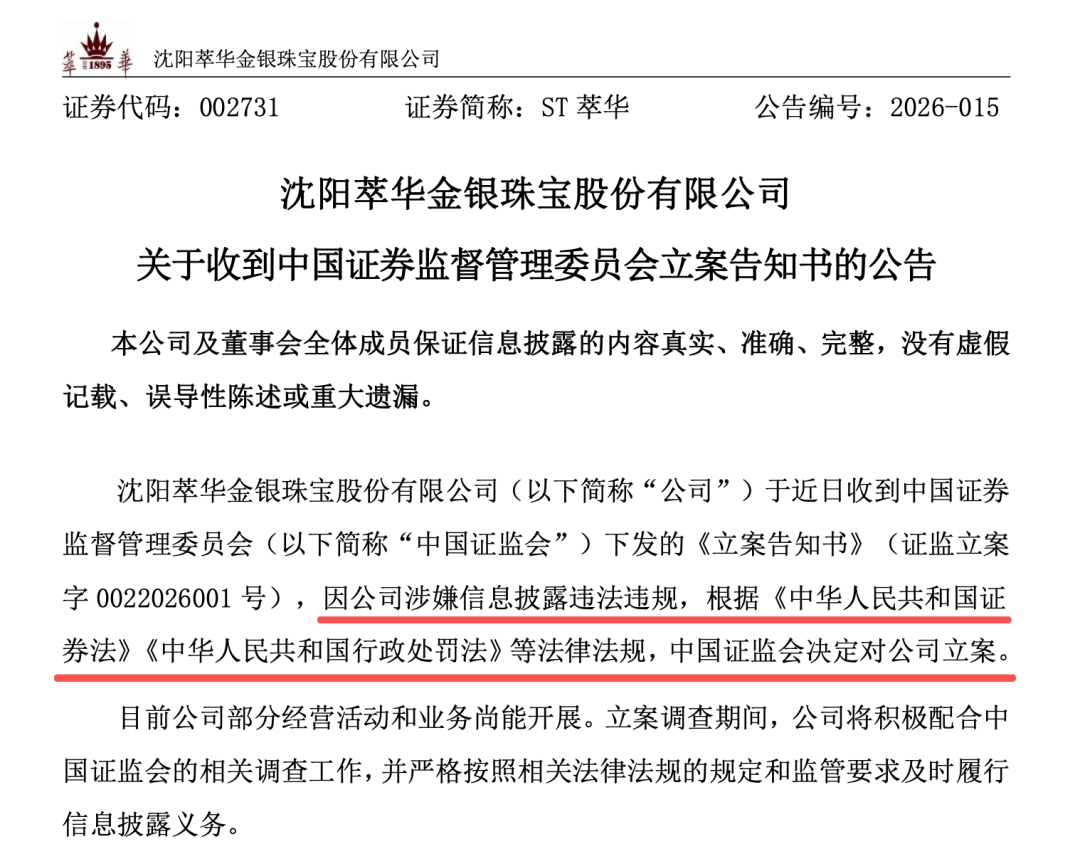 萃华珠宝因涉嫌信息披露违法违规,被中国证监会立案。