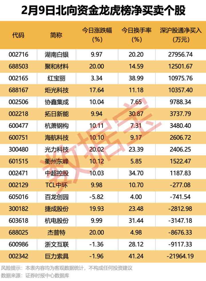 今日龙虎榜现身个股中,11股获北向资金净买入。净买入居首的是湖南白银,金额为2.8亿元;聚和材料、红宝丽、炬光科技均获净买入超1亿元。