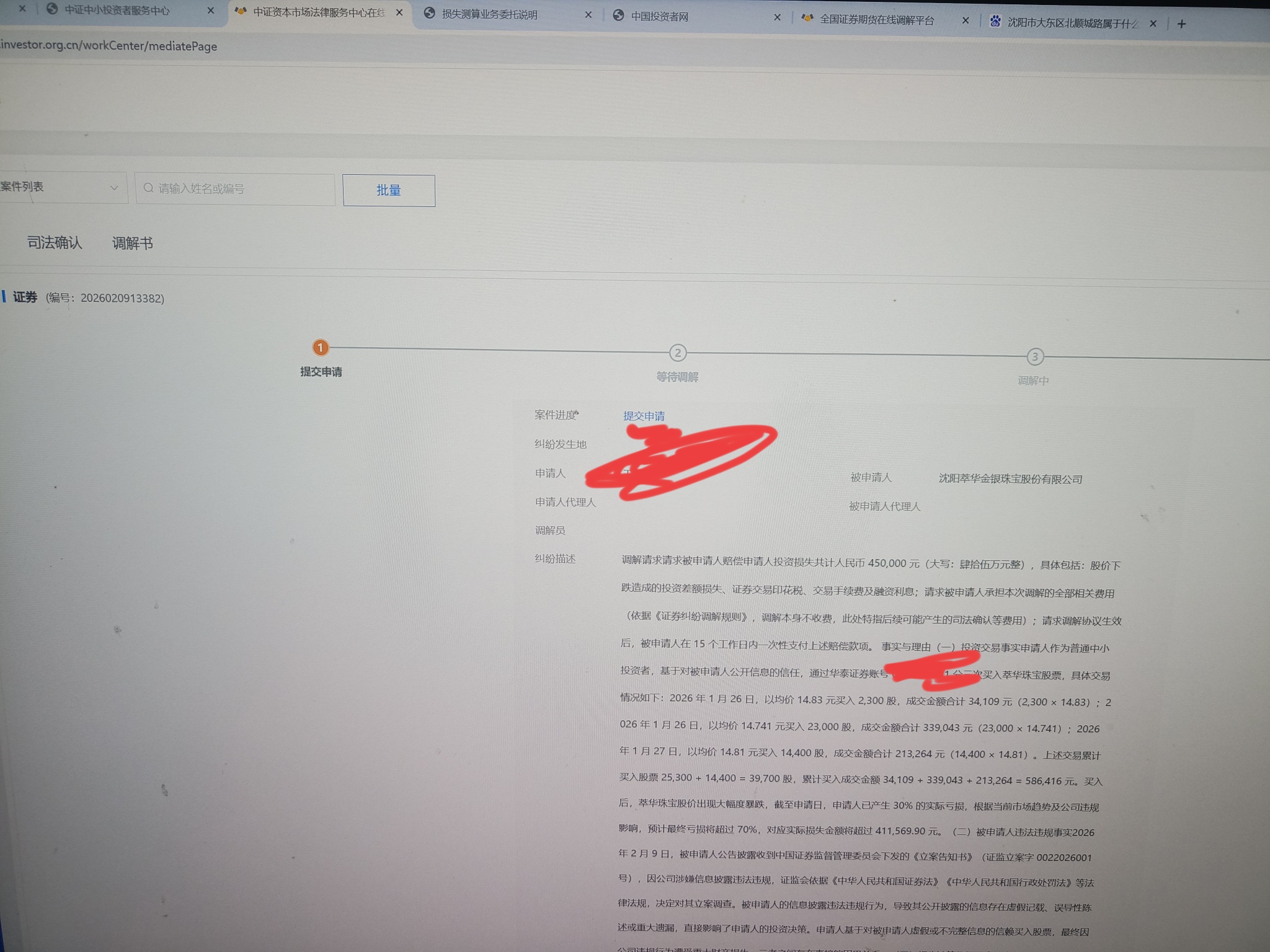 $萃华珠宝(SZ002731)$ 大家索赔去中小投资者 服务中心申请调解 最好白天或者晚上9点前申请网址http://www.isc.com.cn/ 我已经申请了 超过10人申请变成集体申请他们会代为我们打官司 完全不要钱 是证监会下面的!大家不要信 什么律师最后收费又被骗!这个是我把我交易记录让豆包帮写的调解书 大家可以申请去