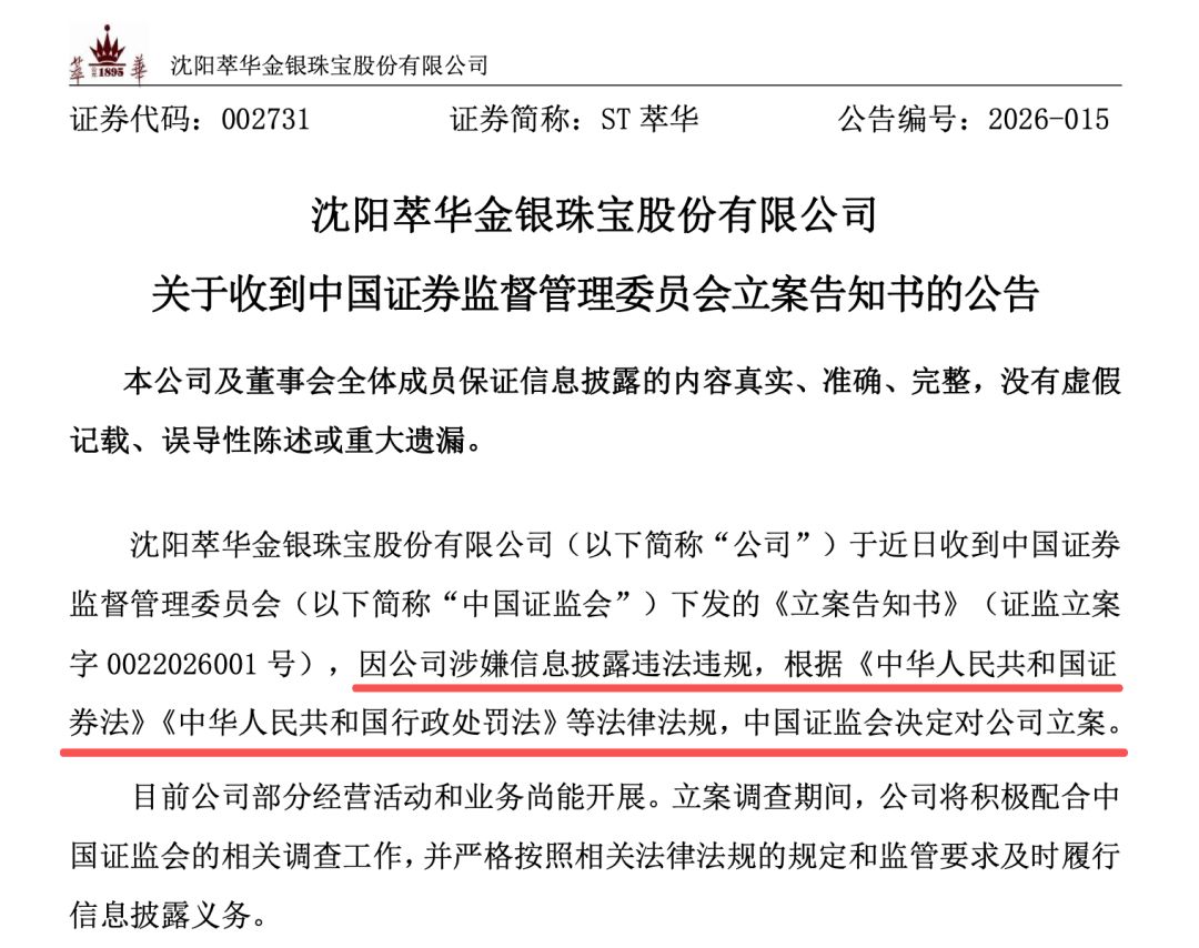 2月9日晚,萃华珠宝(002731.SZ)公告称,公司于近日收到中国证监会下发的《立案告知书》,因公司涉嫌信息披露违法违规,根据相关法律法规,中国证监会决定对公司立案。目前公司部分经营活动和业务尚能开展。