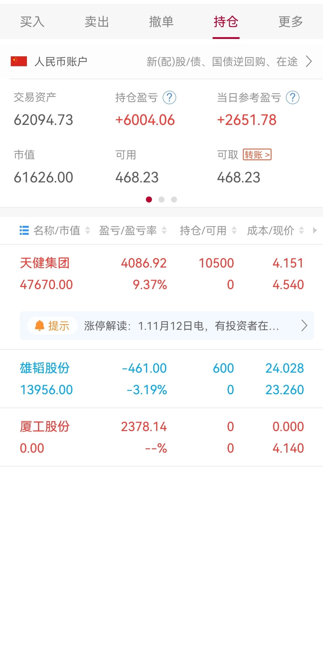 $雄韬股份(SZ002733)$ 今天早上总共操作三次。第1次集中竞价时,愚蠢的买入了雄韬,结果大错特错,极度看好天健集团。水下冷痛割爱卖出夏工股份。仁吃仁的世界,没有人会在乎你,不要有任何情怀。