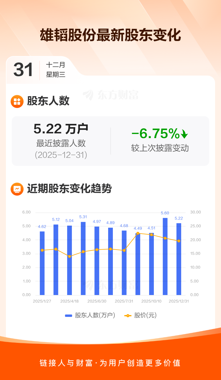 雄韬股份最新披露数据显示,截至12月31日公司股东户数为5.22万户,较上期(2025年11月28日)减少3784户,降幅为6.75%。户均持有流通股数量由上期的6583股上升至7060股,户均持股金额由上期的13.60万元增加至13.86万元。