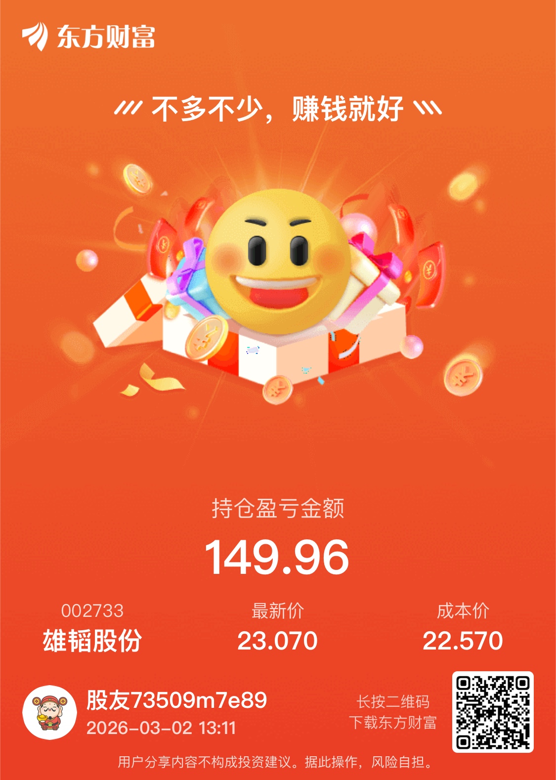 温馨提示: 1.根据《证券法》规定,禁止编造、传播虚假信息或者误导性信息,扰乱证券市场;2.用户在本社区发表的所有资料、言论等仅代表个人观点,与本网站立场无关,不对您构成任何投资建议。用户应基于自己的独立判断,自行决定证券投资并承担相应风险。《东方财富社区管理规定》