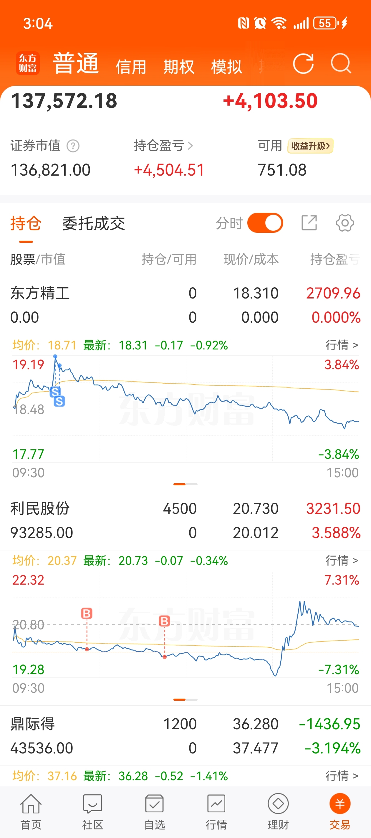 十三万挑战二十万第四天,今天卖点不错,买点拉胯,东方最高点卖了,绿四个点低吸利民