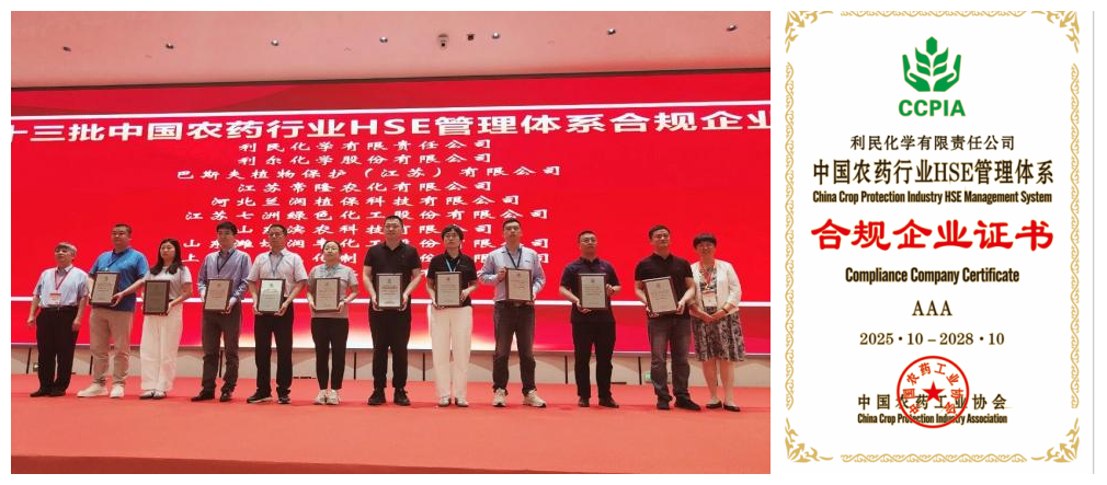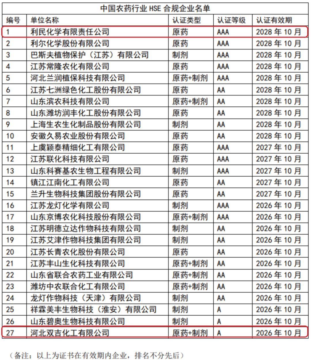 近日,中国农药工业协会公布2025年度中国农药行业HSE(健康、安全、环境)管理体系合规企业认证名单,利民股份子公司——利民化学与双吉化工双双入选。