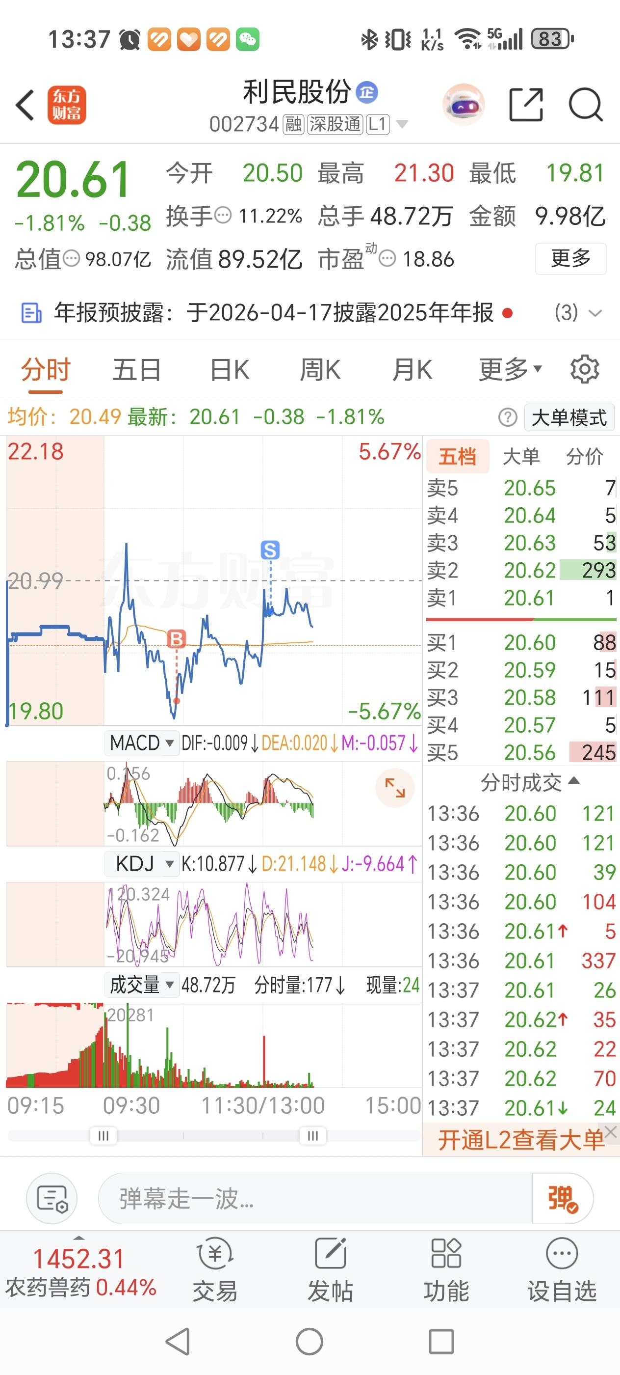 $利民股份(SZ002734)$ 今天果然在20处买回来了