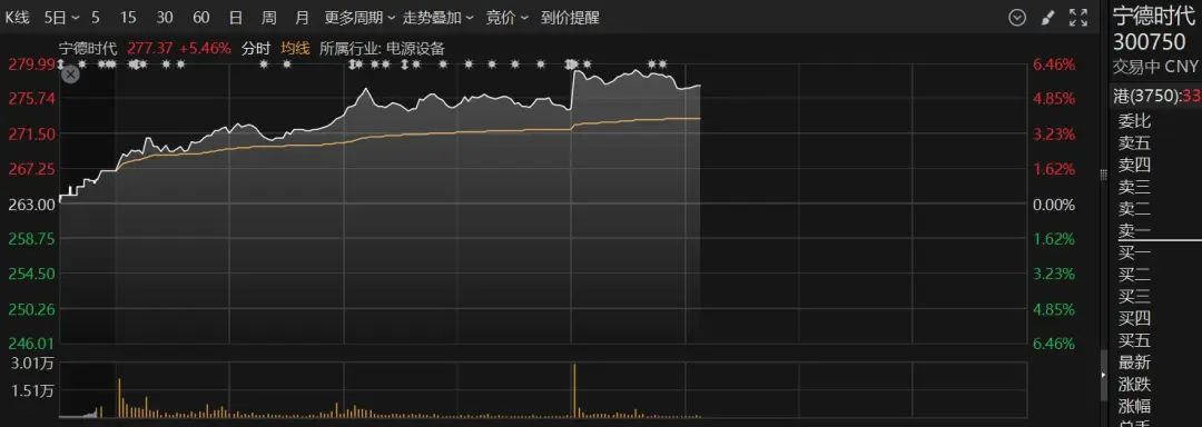创业板指午后涨幅扩大,截至发稿,上涨1.4%。创业板指权重股宁德时代午后直线拉升,一度涨超6%,成交额超110亿元。宁德时代港股今日继续大涨,截至发稿,涨超10%。