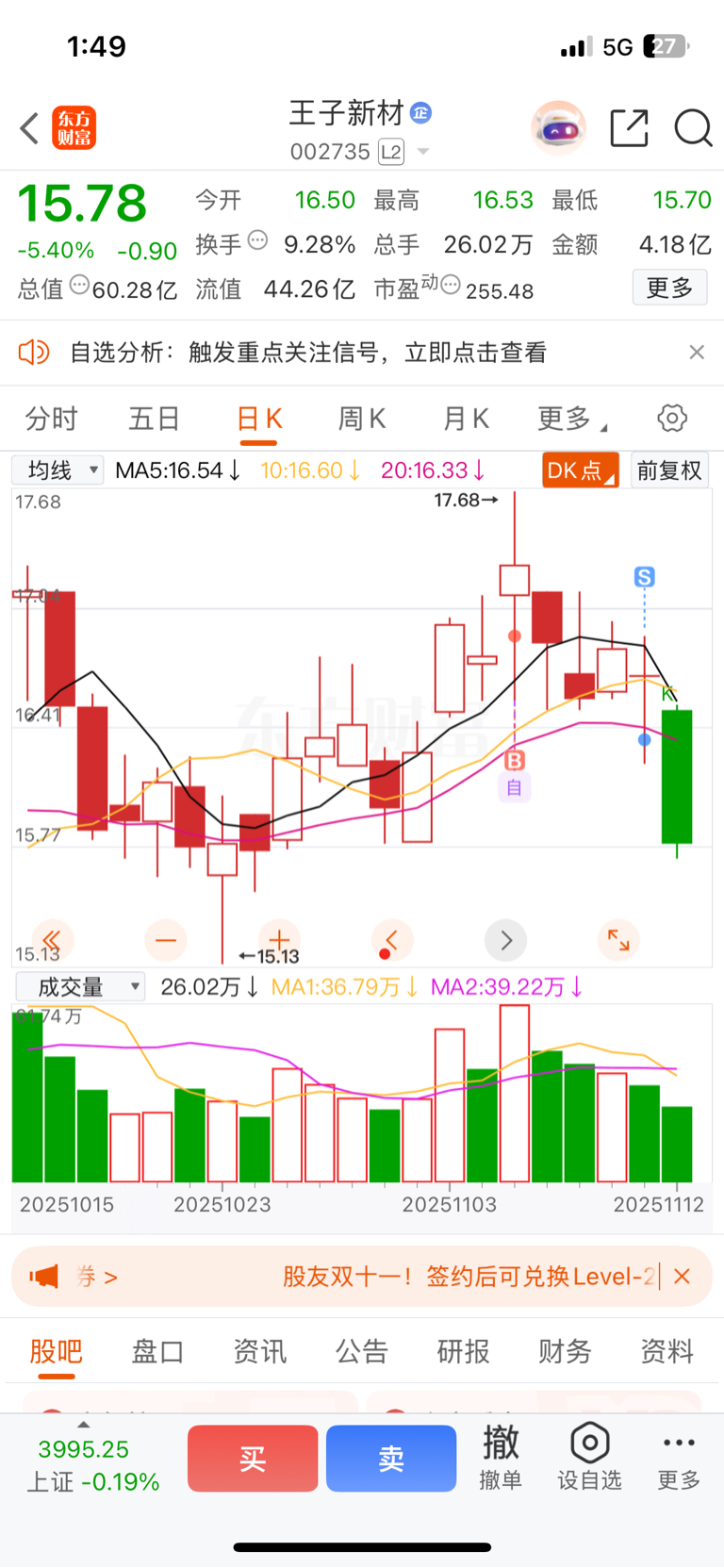 $王子新材(SZ002735)$ 我勒个草,这票亏了三个点,昨天达到我止损点-3%就卖了,我以为会卖飞,没想到今天回头一看,逃过一劫