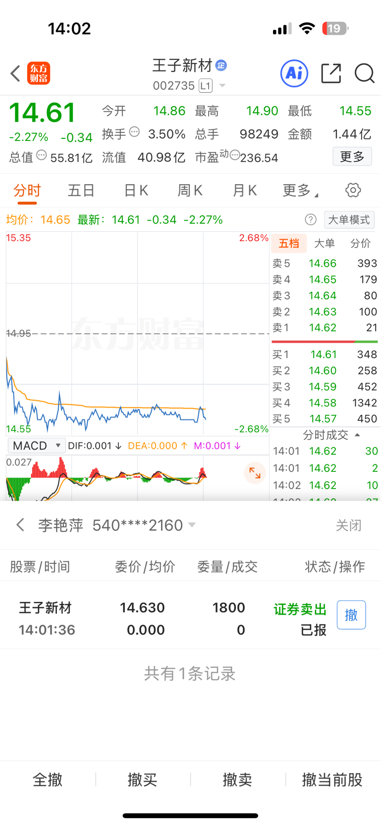 $王子新材(SZ002735)$ 大盘,板块都起来,就因为我挂14.63,都不敢拉起来两分钱吗,绝对在出货了