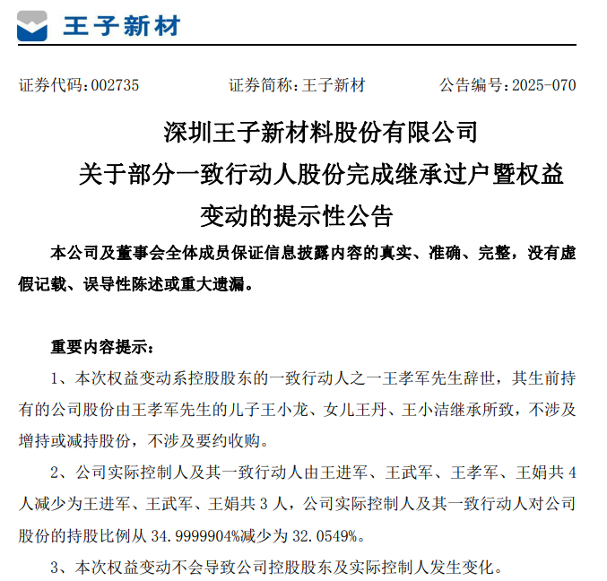 王子新材(002735)12月16日晚间发布关于部分一致行动人股份完成继承过户暨权益变动的提示性公告。