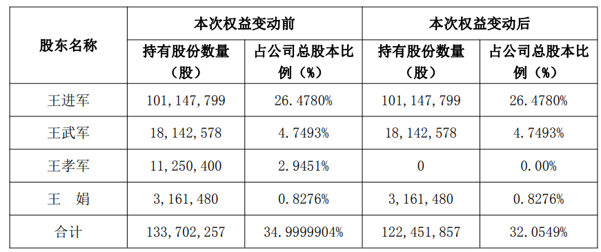 公告称,本次权益变动前,公司控股股东、实际控制人王进军先生持有公司股份101,147,799股,占公司总股本的26.4780%,与其一致行动人王武军、王孝军、王娟合计持有公司股份133,702,257股,占公司总股本的34.9999904%。根据《上市公司收购管理办法》的相关规定,一致行动人王孝军先生辞世后,王孝军先生的一致行动人关系被动解除,其生前持有的公司股份11,250,400股由儿子王小龙、女儿王丹、王小洁共同继承,王小龙、王丹、王小洁与王进军先生不构成一致行动人关系。本次权益变动后,公司控股股东、实际控制人王进军先生持有公司股份101,147,799股,占公司总股本的26.4780%,与其一致行动人王武军、王娟合计持有公司股份122,451,857股,占公司总股本的32.0549%。本次权益变动前后,公司控股股东及一致行动人持股情况具体如下表所示: