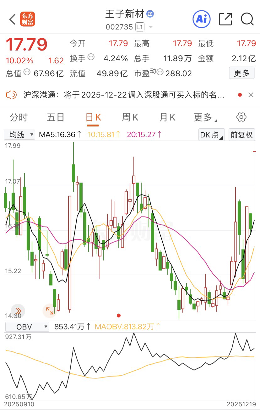12.15送出的王子新材今日迎来一字板!