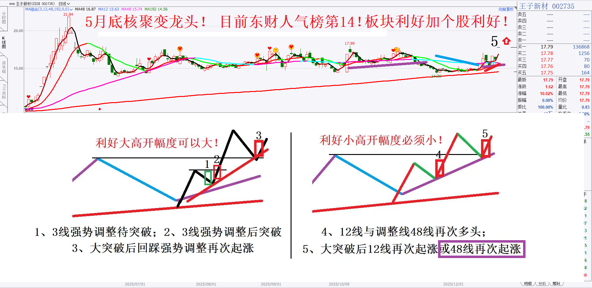 12月19日盘后22日盘前:002735王子新材。看好二连板的理由:1、板块利好和个股利好叠加刺激一字板,带动核聚变板块多达6家板;2、图形上12线和48线再次粘合多头上扬;3、前期可控核聚变板块龙头,3月线或48日线的调整强势且时间足够充分。预计下周一开盘在19.02元附近追涨。