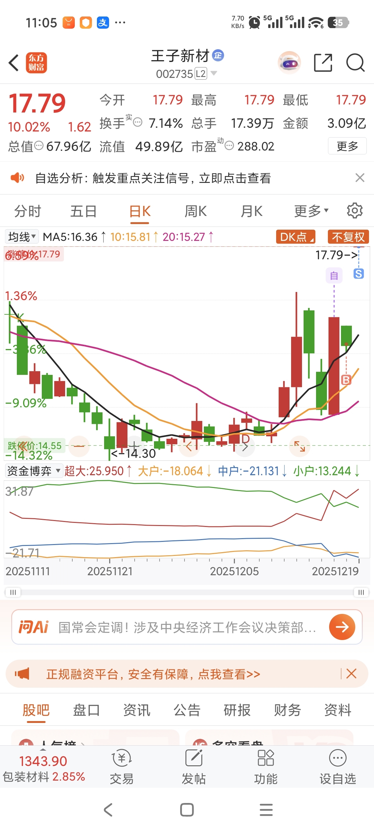 $王子新材(SZ002735)$ 前面一天涨停第二天跌停还是小小的16.2买了一千股结果太意外了