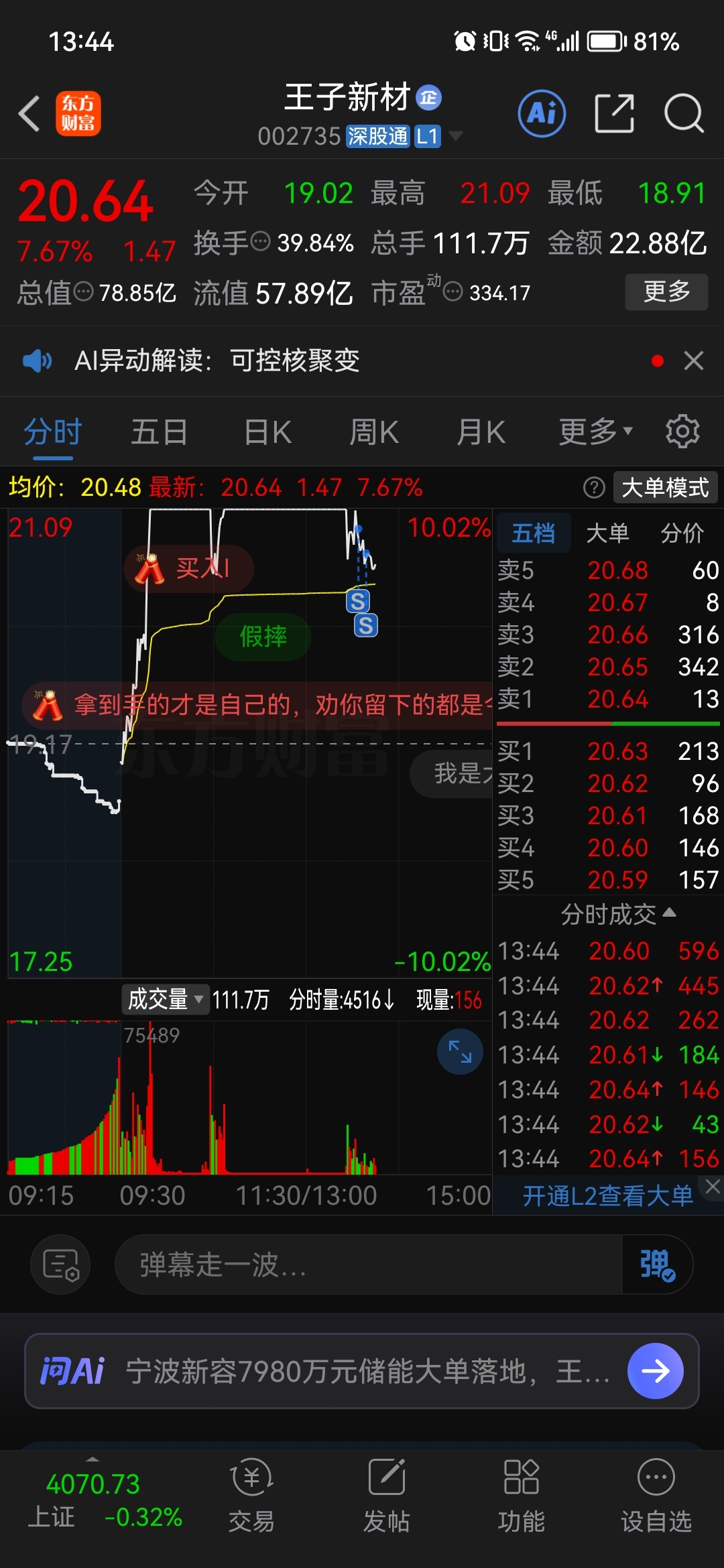 $王子新材(SZ002735)$ 成交量太多了,走了,留下的发财