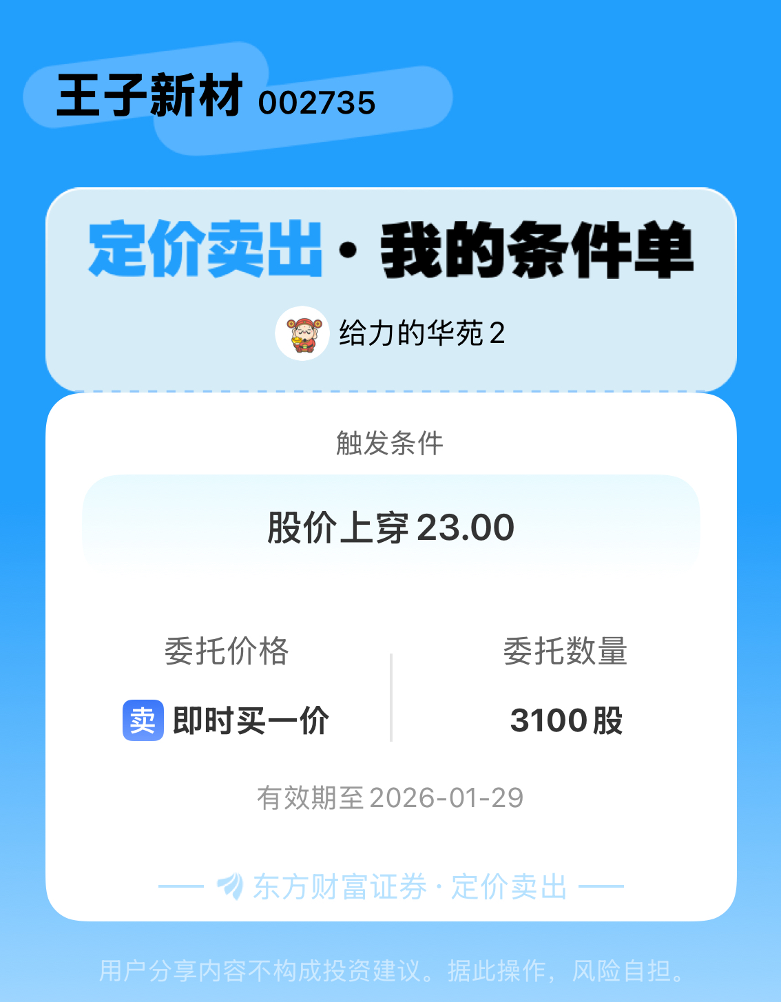 #条件单交流# #定价卖出晒单# 一位股神设置了一个定价卖出条件单,接下来就是见证奇迹的时刻~$王子新材(SZ002735)$