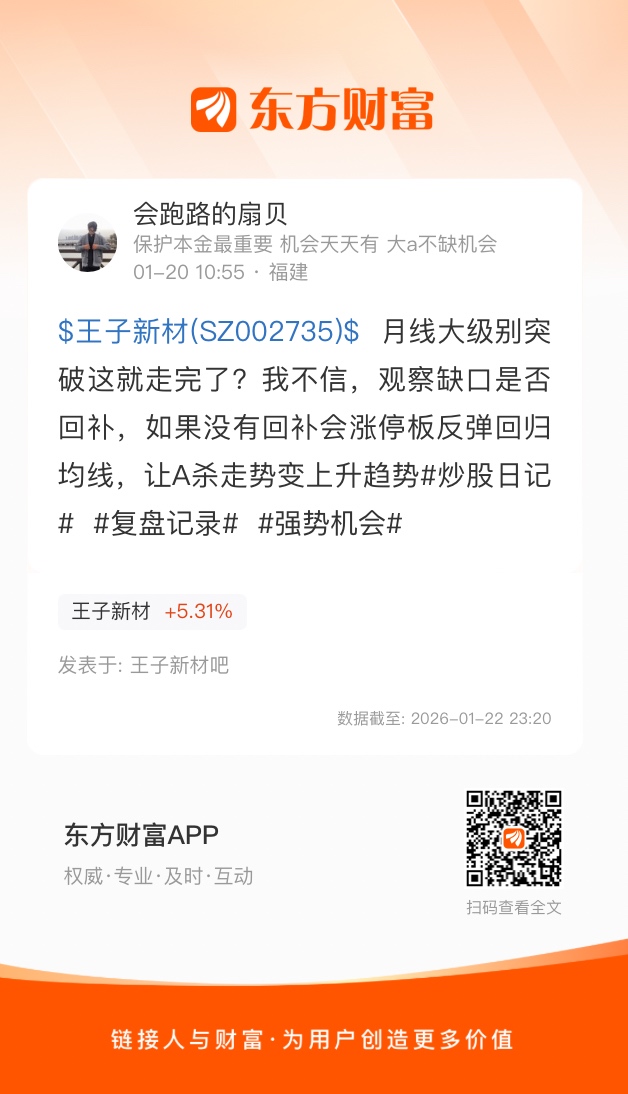 $王子新材(SZ002735)$ 月线大级别突破这就走完了?我不信,观察缺口是否回补,如果没有回补会涨停板反弹回归均线,让A杀走势变上升趋势#炒股日记# #复盘记录# #强势机会#