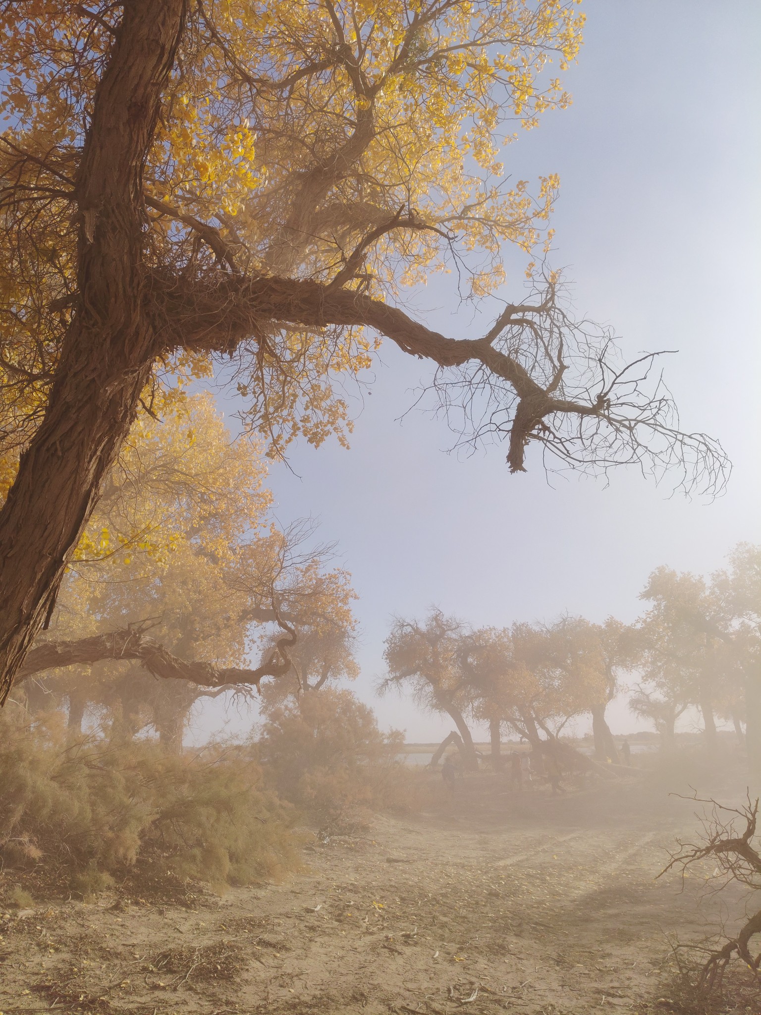 黄沙漫漫披金装,弱水河畔游人欢。尔等来去何匆匆,胡杨一梦跨千年!