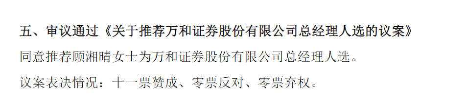 12月8日晚,国信证券发布公告称,公司董事会审议通过《关于推荐万和证券股份有限公司总经理人选的议案》,同意推荐顾湘晴为万和证券总经理人选。
