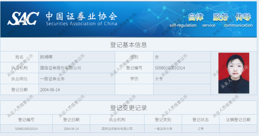 中证协信息显示,顾湘晴是一名国信证券“老员工”。2004年,她的执业机构就是国信证券,登记类别为一般证券业务,供职国信证券长达21年。