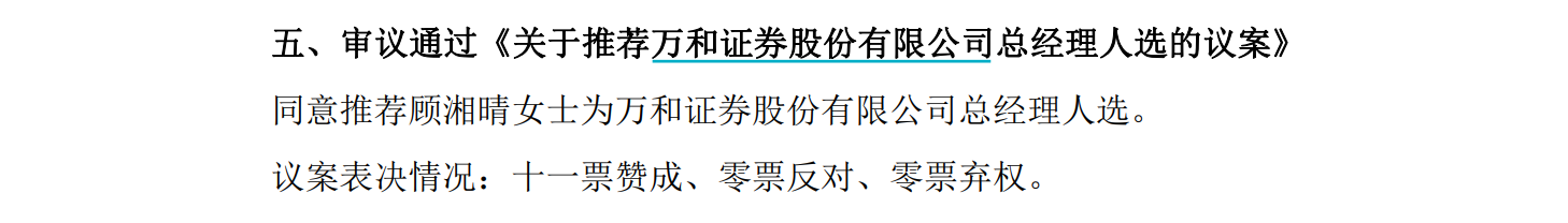 12月8日,国信证券(002736.SZ)披露第五届董事会第四十六次会议(临时)决议公告,其中,第五条有关于“同意推荐顾湘晴为万和证券股份总经理人选”议案获得了公司董事会全票通过。