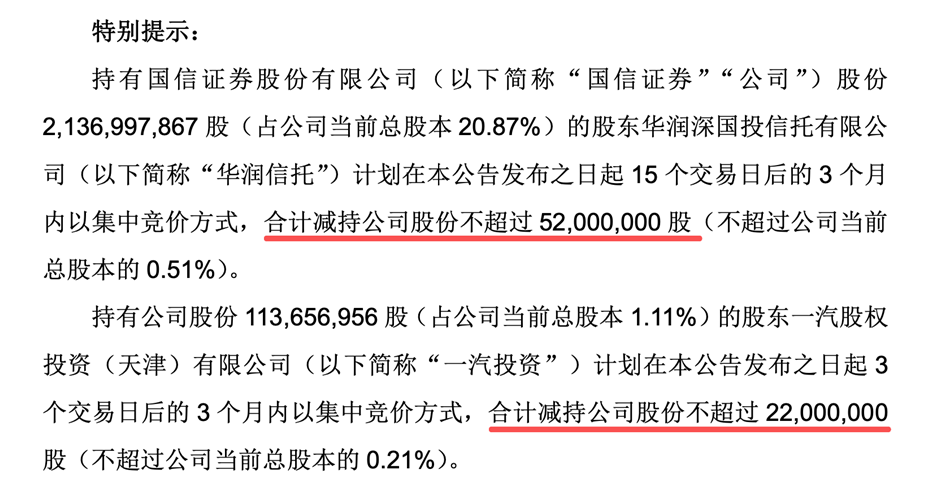 就在国信证券推进万和证券整合的同时,其自身的资本运作与风险状况也成为市场关注的重点。最新公告显示,公司两大股东计划在未来三个月内进行减持:华润信托拟自15个交易日之后,通过集中竞价方式减持不超过5200万股,占总股本的0.51%;一汽股权投资(天津)有限公司则计划自3个交易日后减持不超过2200万股,占总股本的0.21%。按当前股价估算,两大股东合计套现金额将超过9亿元。
