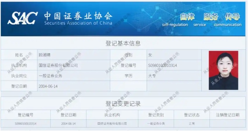 顾湘晴信息,来源:中国证券业协会