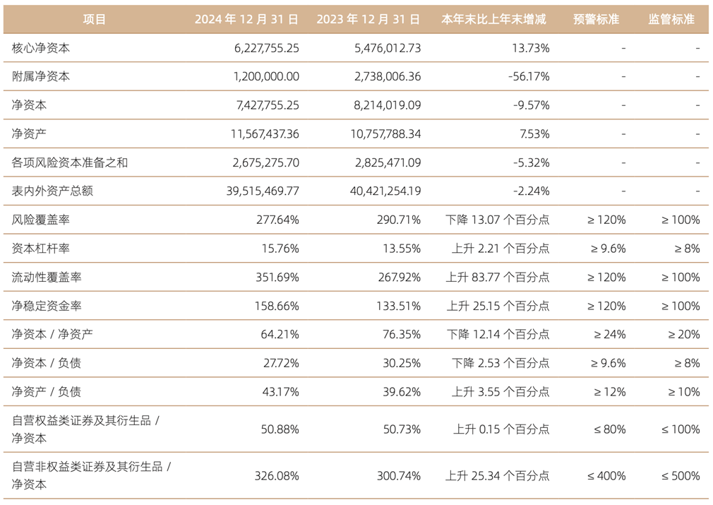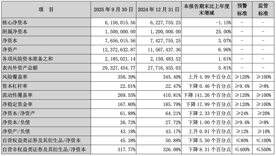 在资产负债及风险管控方面,国信证券整体资本规模继续扩张。2024年末公司合并层面资产总额达到5.02万亿元,2025年三季度进一步增至5.61万亿元。截至2025年9月末,母公司流动性覆盖率为269.55%,虽较2024年末的410.81%下降141.26个百分点,但仍显著高于监管要求;风险覆盖率350.39%、资本杠杆率22.01%、净稳定资金率167.80%,均处于合规区间。
