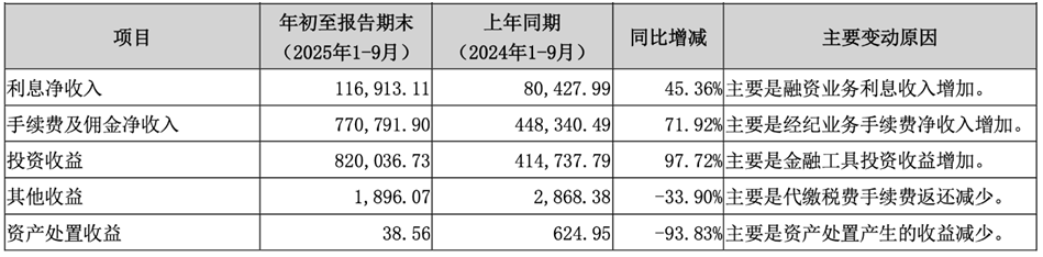 分业务板块来看,结构分化明显。2024年投资与交易业务收入同比暴增68.86%,占营业总收入比重升至44.64%,成为拉动增长的绝对主力;财富管理与机构业务收入同比增长17.97%,是公司稳定经营的核心支撑。2025年前三季度,母公司层面手续费及佣金净收入同比增长71.92%,投资收益同比增长97.72%,利息净收入、手续费及佣金净收入、投资收益三大核心盈利来源同比增幅均超过45%。