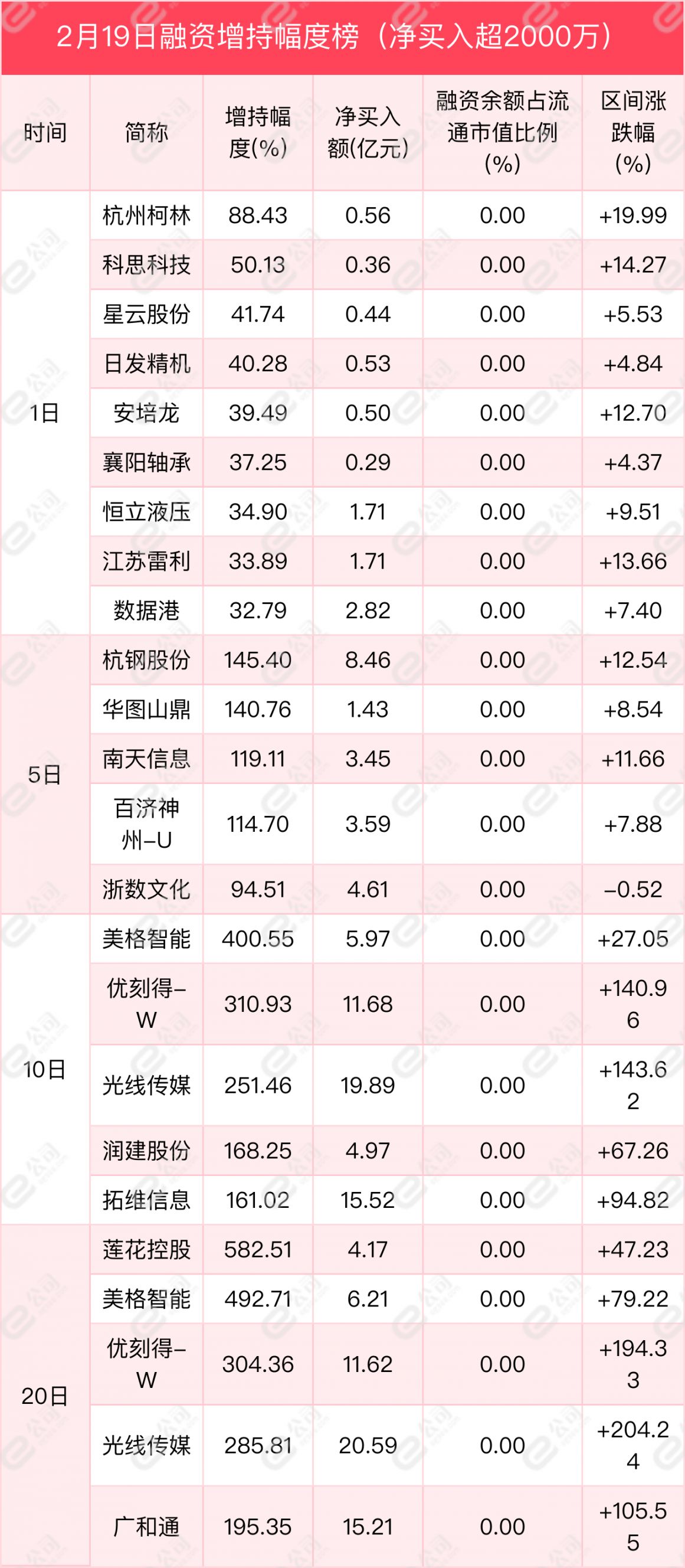 从增减持幅度来看,单日净买卖超2000万元以上的个股中,杭州柯林、科思科技、星云股份获融资增持幅度居前,分别为88.43%、50.13%、41.74%。