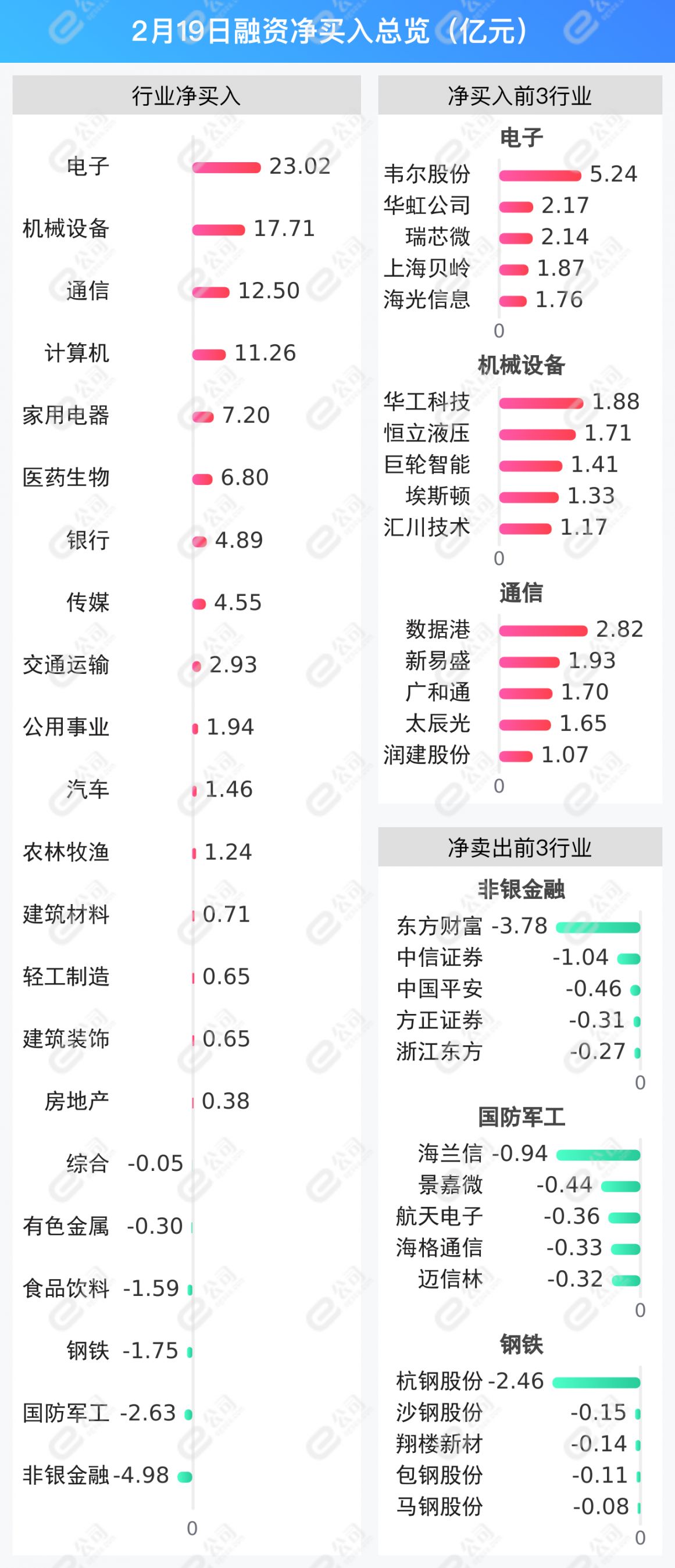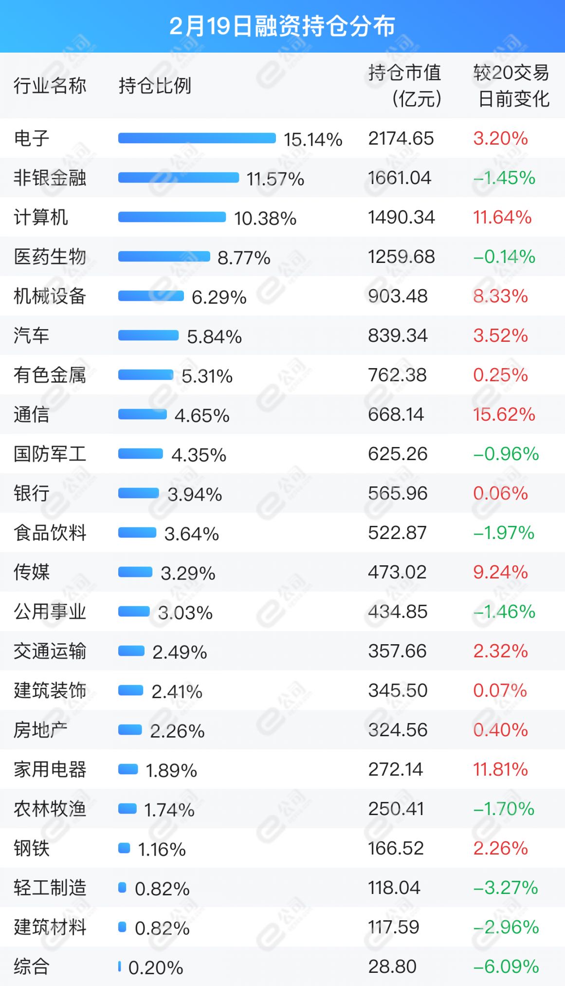 e公司数据统计显示,截至2月19日,融资持仓市值前五行业为电子、非银金融、计算机、医药生物、机械设备,占持仓总市值52.15%。