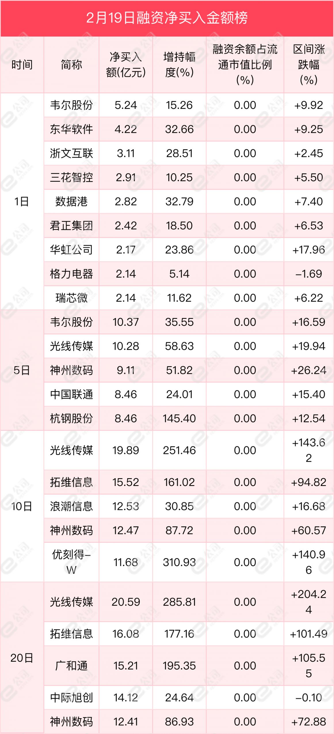 从买卖金额来看,韦尔股份、东华软件、浙文互联获融资净买入金额居前,分别为5.24亿元、4.22亿元、3.11亿元,增持幅度分别为15.26%、32.66%、28.51%。