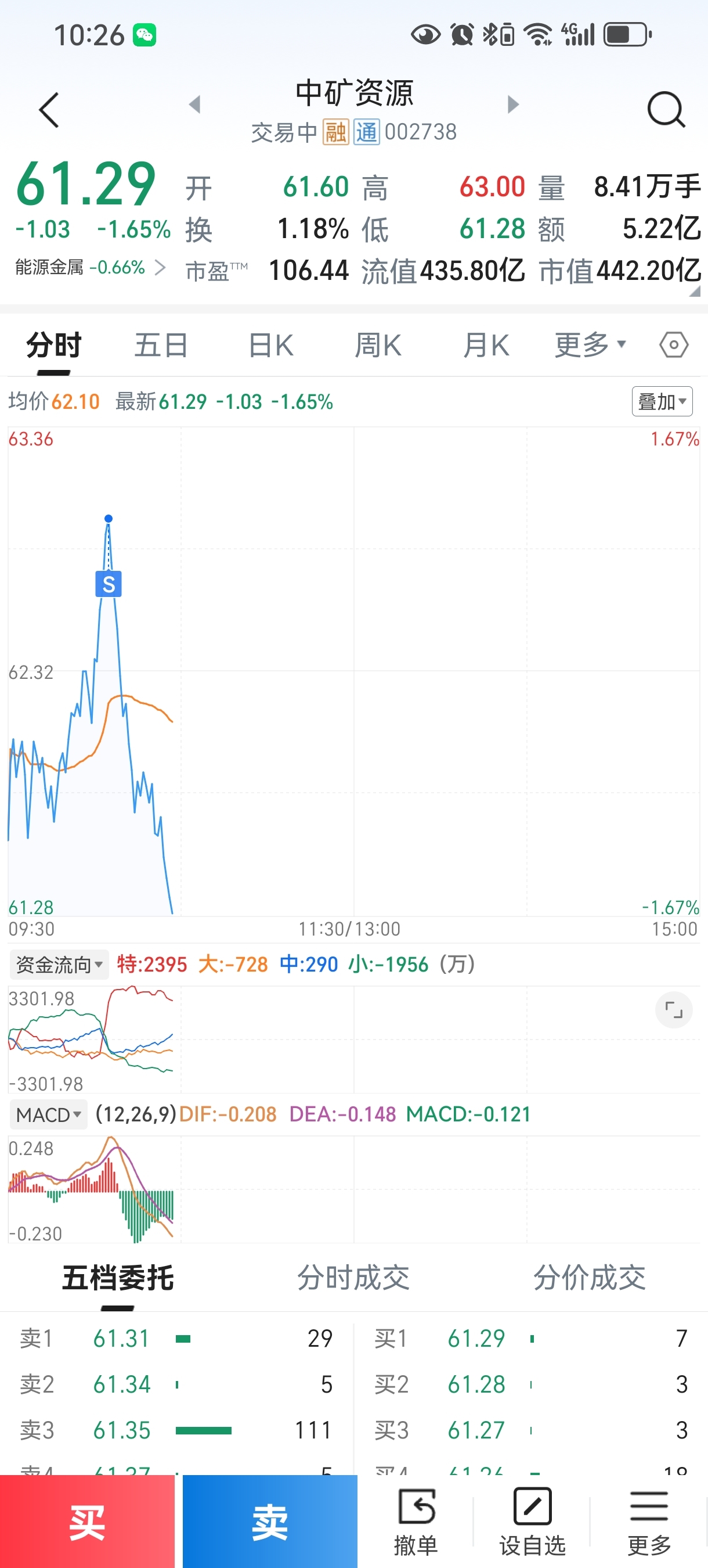 $中矿资源(SZ002738)$ 他努力涨到63就为了让我下车