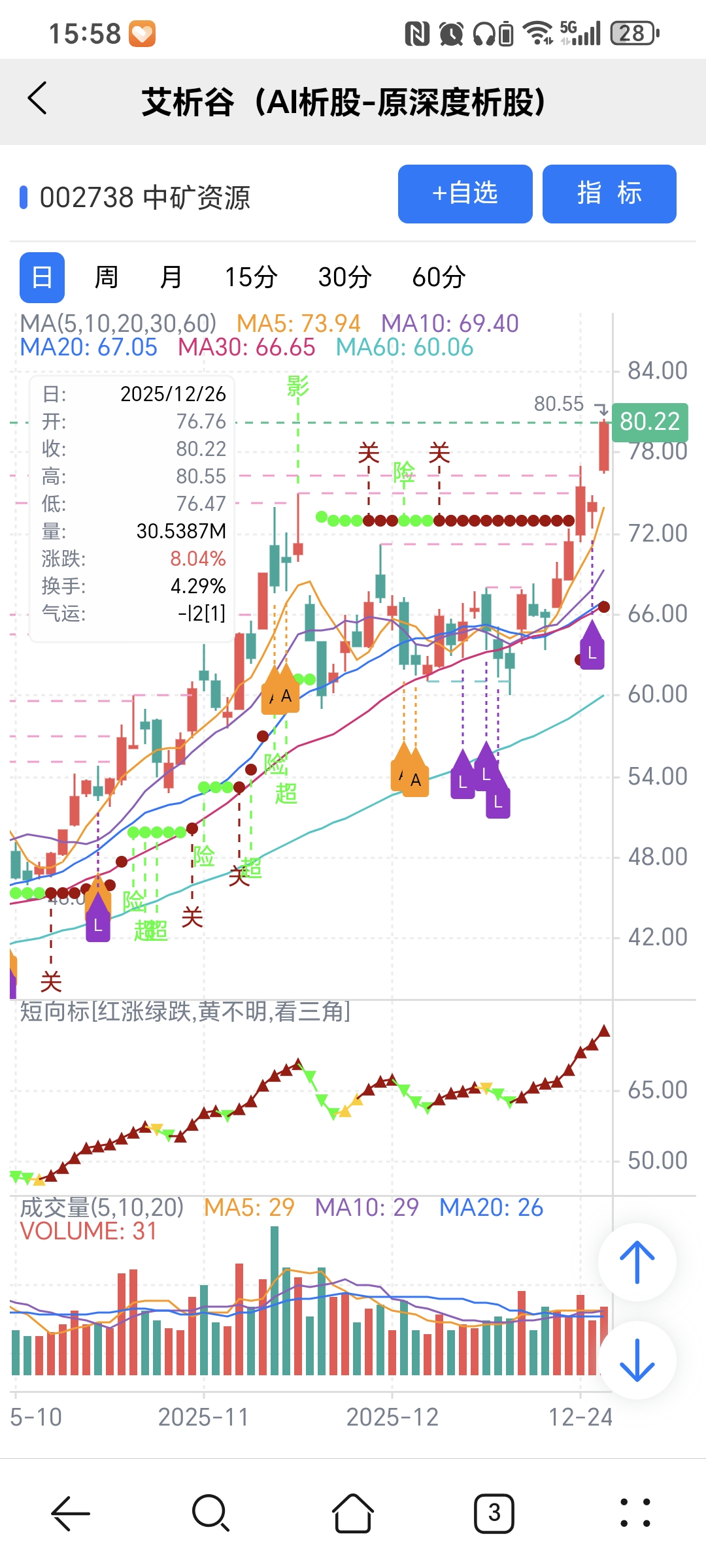 红绿小圆点是艾析谷的量化指标-超级短趋线,是趋势跟踪+突破类的量化指标,完全免费。