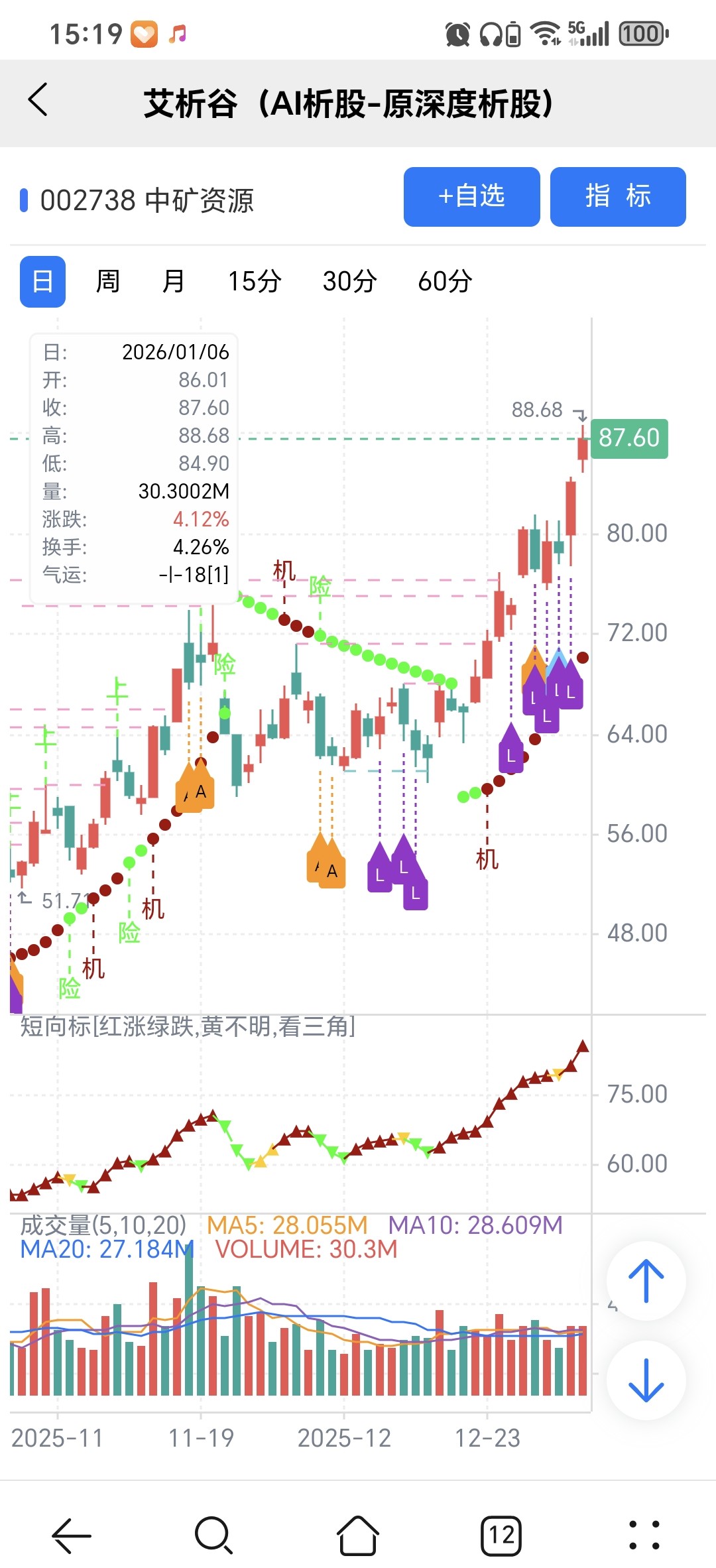 风险:股价下穿艾短波或红变绿、绿字。