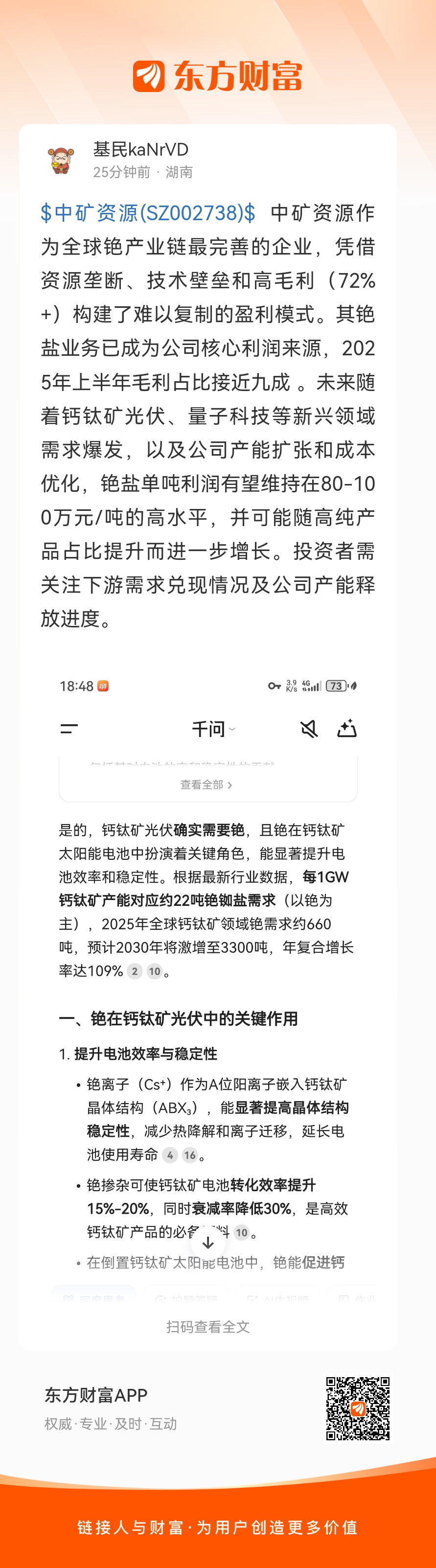 $中矿资源(SZ002738)$ 中矿资源作为全球铯产业链最完善的企业,凭借资源垄断、技术壁垒和高毛利(72%+)构建了难以复制的盈利模式。其铯盐业务已成为公司核心利润来源,2025年上半年毛利占比接近九成 。未来随着钙钛矿光伏、量子科技等新兴领域需求爆发,以及公司产能扩张和成本优化,铯盐单吨利润有望维持在80-100万元/吨的高水平,并可能随高纯产品占比提升而进一步增长。投资者需关注下游需求兑现情况及公司产能释放进度。