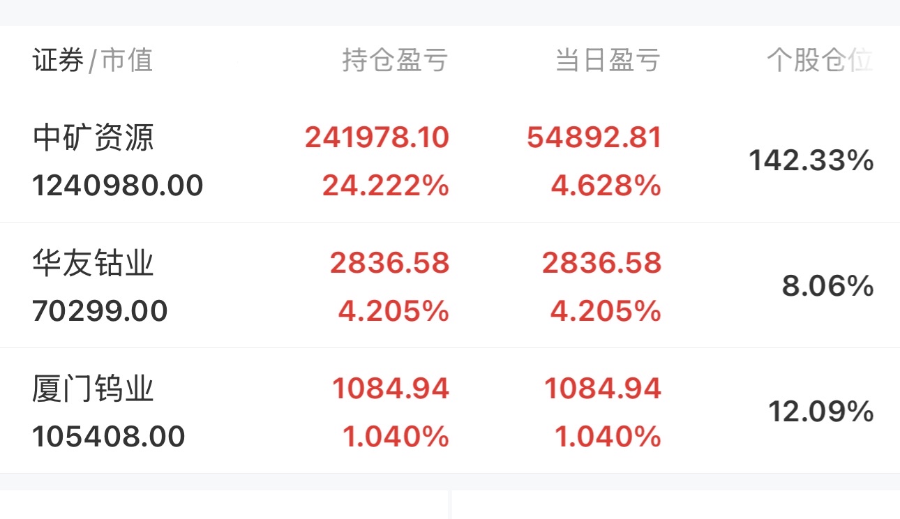 $中矿资源(SZ002738)$ 涨到我头昏眼花,我都满仓满融资持仓了$华友钴业(SH603799)$ $厦门钨业(SH600549)$