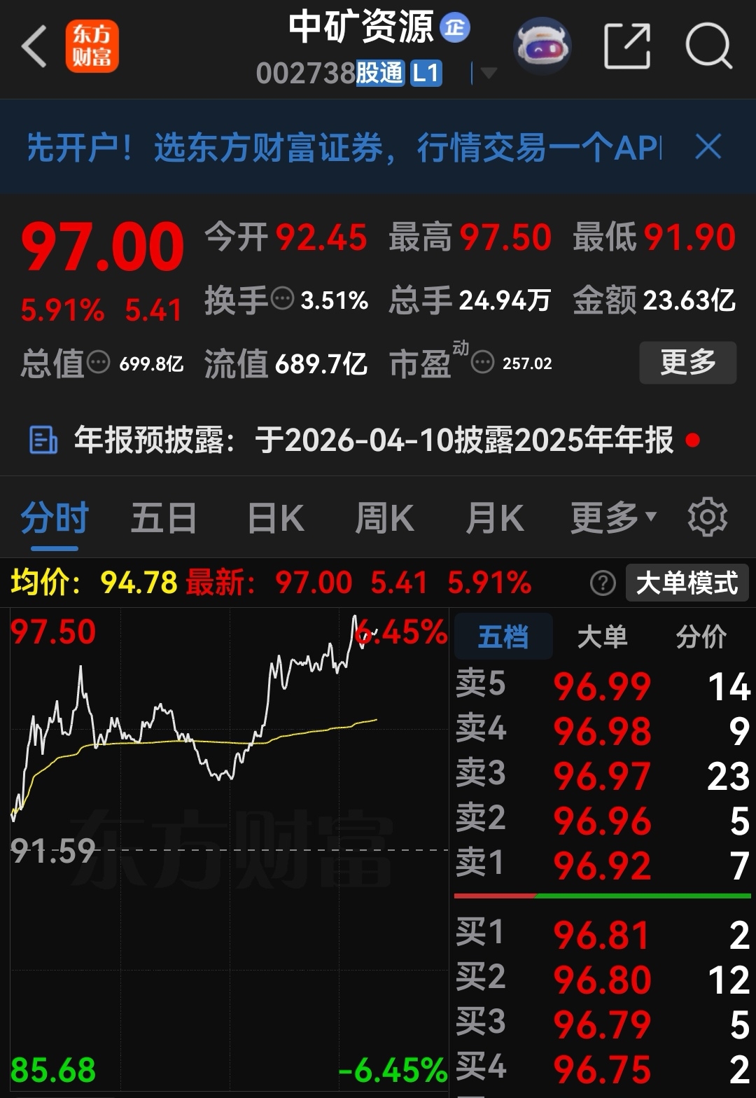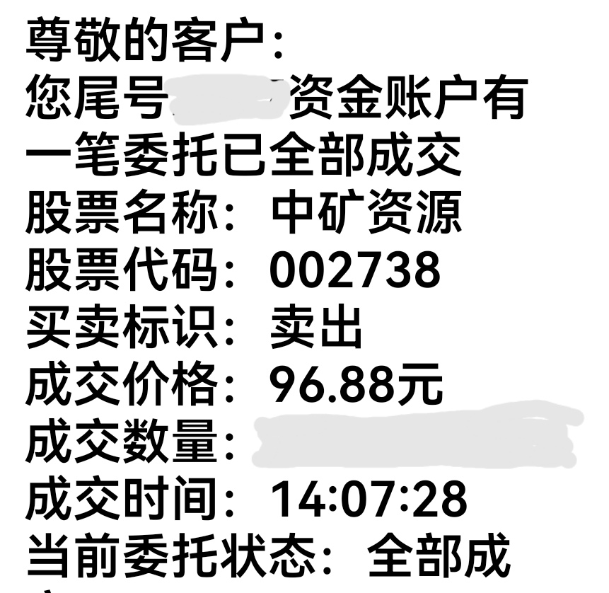 以96.88挂单继续减仓卖出中矿资源,这笔挂单可算成交了,这柳成荫了花也开了,这