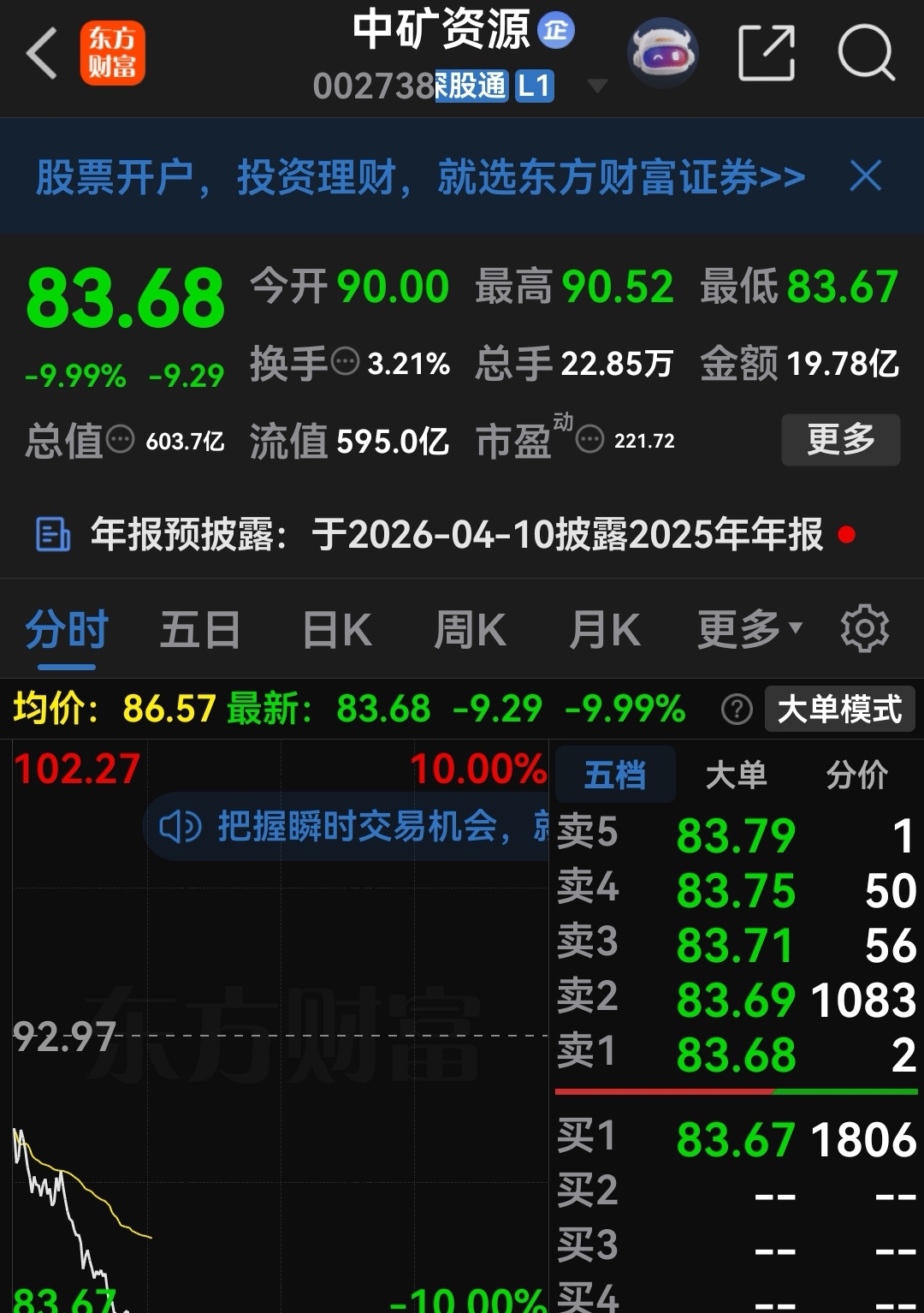 以83.67的跌停板价挂单买回96.88卖掉的中矿资源,不知道此时买回来是否合适