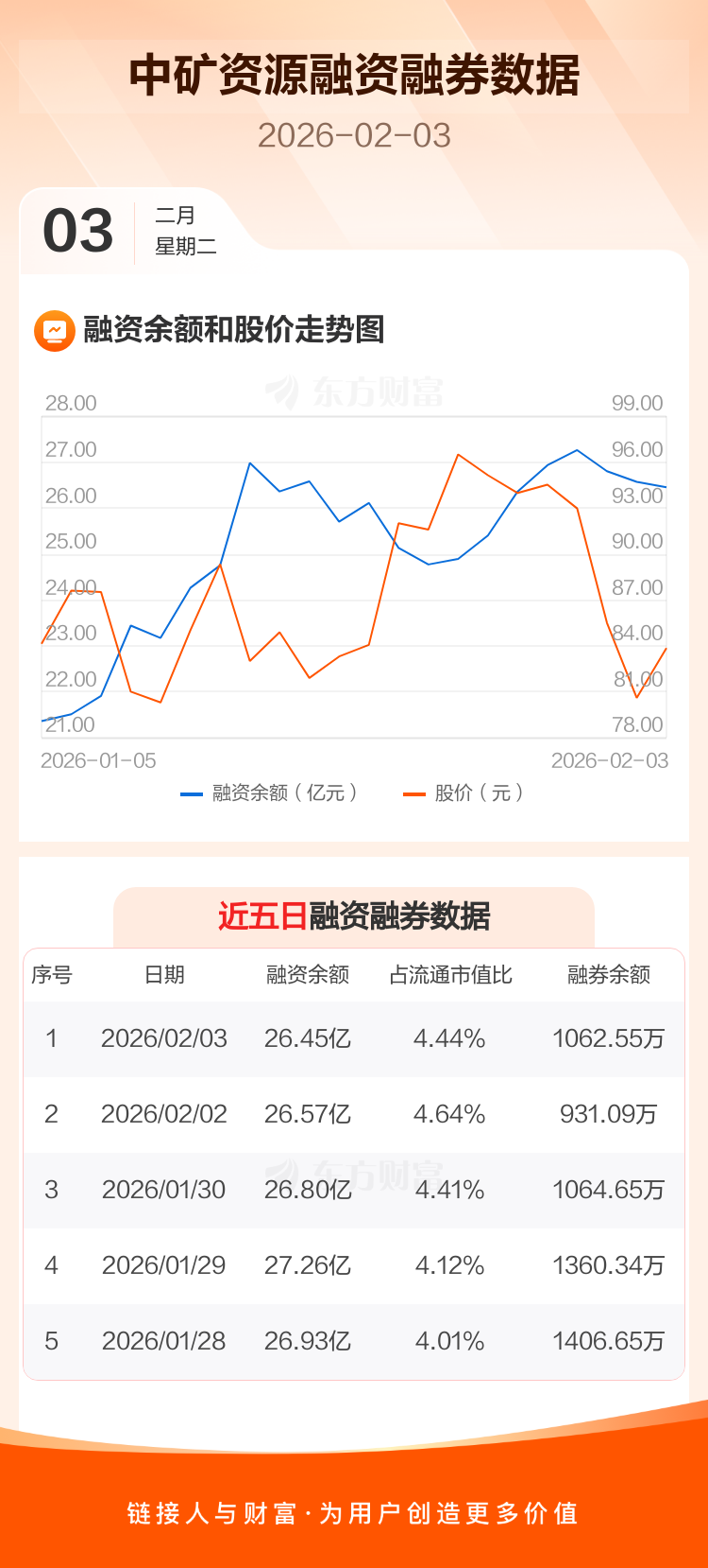 交易所最新数据显示,中矿资源于2026年2月3日获融资买入2.23亿元,融资偿还2.35亿元,当日融资净偿还1216.43万元。目前,该股融资余额26.45亿,占流通市值比例为4.44%。