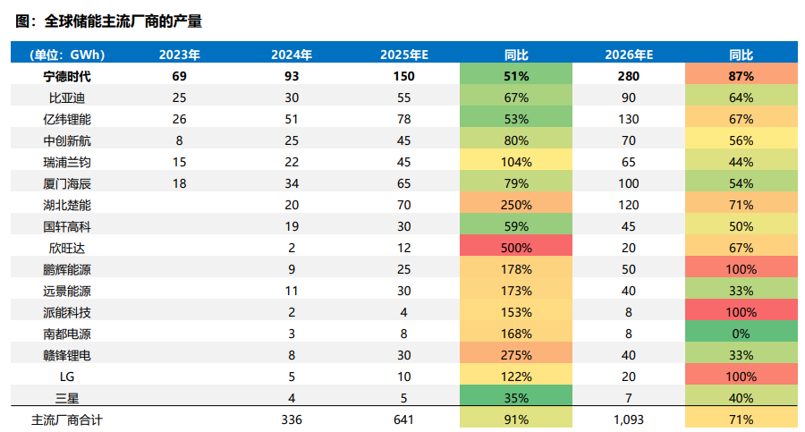全球储能主流厂商的产量。数据来源:东吴证券研报