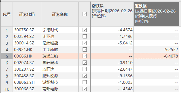 经央广财经记者初步梳理,东吴证券列举的16家全球储能主流厂商中,共涉及10家A股或港股上市公司。东方财富数据显示,2月26日这10家公司股价均出现下滑,其中宁德时代下跌4.47%、比亚迪下跌1.75%、亿纬锂能下跌5.04%、中创新航下跌9.26%、瑞浦兰钧下跌6.41%、国轩高科下跌0.91%、欣旺达下跌2.64%、鹏辉能源下跌9.15%、派能科技下跌1%、南都电源下跌1.45%。